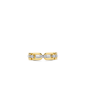 Deze vergulde TI SENTO ring 12321ZY is een verfijnde mix van tijdloos design en ingetogen glamour. De ring heeft vergulde schakels die bijeengehouden worden door kleine pavé schakels met zirkonia ste... lees meer