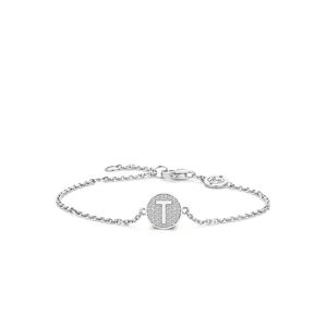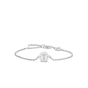 Deze stijlvolle TI SENTO initialen-armband is gemaakt van gerhodineerd sterling zilver. Het element met de letter T is aan twee kanten afgewerkt. De ene zijde is een met de hand gezette pavé schijf, waarin de letter is gemaakt van gepolijst zilver van het hoogste gehalte. De andere zijde is eveneens voorzien van de letter T, maar dan geplaatst in een rijzetting van briljant geslepen zirkonia's. Het geheel is gemaakt van het hoogste gehalte sterling zilver en voorzien van een rhodiumlaag. Dit zorgt voor een langere levensduur en extra glans van het sieraad. De armband is te dragen op een lengte van 17 tot en met 22 centimeter.