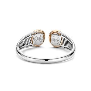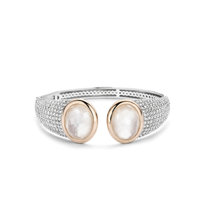 Deze TI SENTO armband is een echte eye-catcher! De grote stenen op het midden van de pols, zijn parelmoer met daarop een kristal. De stenen zijn gezet in een gladomzetting met een rosé plated laag. De ring is gemaakt van gerhodineerd sterling zilver en is aan de zijkanten handgezet met zirconia's in een pavézetting. De rhodiumlaag zorgt voor een langdurige glans en bescherming van het sieraad. Door de scharnier aan de zijkant van de armband, is deze eenvoudig om te doen en zorgt het voor draagcomfort. Houdt de rest van je sieraden eenvoudig voor een Milanese stijl; de armband is de blikvanger!