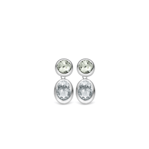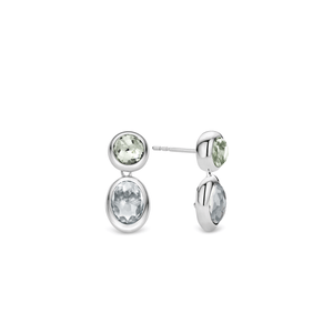 Deze oorstekers uit de TI SENTO collectie bestaan uit twee elementen. Het bovenste deel van de oorstekers bestaat uit een facetgeslepen groene kristal. Daaronder hangt een ovaal blauwgrijze kristal aan een schakel. De stenen zijn beide facet geslepen en in een bezel zetting in het gerhodineerd sterling zilver geplaatst. Hierin kun je jouw favoriete sieraad goed bewaren wanneer je het even niet draagt.