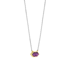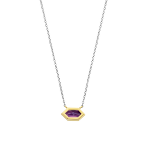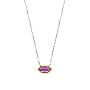 Deze TI SENTO vergulde ketting 34041PU pronkt met een charmante amethistpaarse steen, die wordt gecompleteerd door de luxe van een geelgoudkleurig zetting. De intens paarse tint straalt een gevoel van elegantie en mystiek uit. De paarse steen is stevig bevestigd in een verguld geometrisch montuur, wat haar allure versterkt en een vleugje elegantie aan het geheel toevoegt. Deze ketting is volledig vervaardigd uit premium 925 sterling zilver en verguld voor een stijlvol en warm accent. Het paarse middenstuk hangt sierlijk aan een verfijnde zilveren ketting. Draag het solo om het in de spotlight te zetten of combineer het en draag het in laagjes met andere kettingen voor een extravagante look. Al onze colliers zijn nikkelvrij en hypoallergeen.