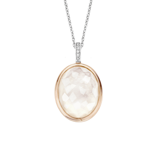 Deze ovale TI SENTO hanger is gemaakt van gerhodineerd sterling zilver. De hanger is gezet met een parelmoer doublet in een strakke gladomzetting. Deze zetting is voorzien van een rosé plated laag. De clip-eye, waarmee de hanger aan een zilveren ketting of clipring gedragen kan worden, is gezet met zirconia's. De achterzijde van de hanger is voorzien van het herkenbare TI SENTO monogram. De rhodium laag zorgt voor een langdurige glans en bescherming van het sieraad. Het Mix & Match concept van TI SENTO maakt het mogelijk de hanger individueel te dragen als ook in combinatie met andere hangers. De hanger wordt geleverd met een fijn basis collier, maar is te combineren met een luxe collier uit de TI SENTO Milano collectie.