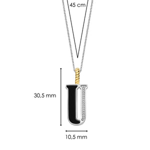 Omarm gedurfde verfijning met deze TI SENTO vergulde zilveren Letter U Hanger 6840BL_U. Deze elegante hanger heeft een slanke zwarte steen die de letter ""U"" vormt, in opvallend contrast met de fonkelende witte cubic zirconia pavé. Gemaakt van glanzend 925 sterling zilver, verzilverd om het te beschermen en glanzend te houden. De clipring is verguld met een rijke goudkleur, wat een gevoel van zelfverzekerde allure uitstraalt. De zwarte steen schittert met een mysterieuze diepte, als een sterrennacht. De letter U staat voor ongekende stijl en onmiskenbare aanwezigheid, en symboliseert zelfverzekerde individualiteit en de kracht om je eigen trends te bepalen. Deze hanger is meer dan een accessoire; het is een krachtige uitdrukking van jouw persoonlijkheid. Draag hem solo voor een dramatisch statement of combineer hem met andere letters of hangers voor een gedurfde, moderne look. De hanger wordt geleverd met een delicate zilveren ketting van 45 cm. Zorgvuldig vervaardigd voor de gevoelige huid, deze nikkelvrije en hypoallergene hanger biedt blijvend comfort en kwaliteit.