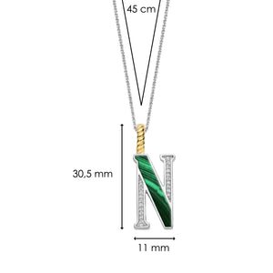 Elke hanger is uniek – de malachietgroene steen met zijn kenmerkende aderstructuur, geïnspireerd op echt malachiet, straalt natuurlijke elegantie uit. De subtiele variaties in kleurtinten en patronen maken elke hanger een uniek en tijdloos statement, ontworpen om te koesteren. Ervaar de kracht van transformatie met deze TI SENTO vergulde zilveren Letter N Hanger 6840MA_N. Deze fascinerende hanger bevat een prachtige malachietgroene steen die de letter "N" vormt, verfraaid met een sprankelend pavé van witte zirkonia. Gemaakt van premium 925 sterling zilver en verzilverd om het te beschermen en stralend te houden. De clipring is verguld met een rijke goudkleur voor een luxueuze en warme uitstraling. De malachietgroensteen straalt de energie van vernieuwing uit en herinnert je aan je eigen potentieel voor groei en transformatie. De letter N symboliseert nieuwheid en vernieuwing, en belichaamt een eigentijdse stijl. Deze hanger is meer dan een sieraad; het is een symbool van persoonlijke evolutie. Draag het solo voor een opvallend statement of combineer het met andere letters of hangers voor een trendy, gelaagde look. De hanger wordt geleverd met een delicate zilveren ketting van 45 cm. Speciaal ontworpen voor een gevoelige huid, biedt deze nikkelvrije en hypoallergene hanger langdurig comfort en kwaliteit.