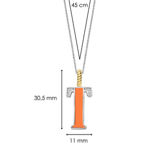 Omarm gedurfde expressie met deze TI SENTO vergulde zilveren Letter T Hanger 6840OR_T. Deze levendige hanger heeft een warme oranje steen die de letter ""T"" vormt, in opvallend contrast met een fonkelende pavé van witte cubic zirconia. Gemaakt van premium 925 sterling zilver, verzilverd om het te beschermen en glanzend te houden. De clipring is verguld met een rijke goudkleur. De oranje steen straalt zelfverzekerdheid uit en voegt een kleurrijk accent toe aan elke outfit. Laat deze hanger je expressie van individualiteit zijn. De letter T staat voor trends en verfijning, wat een scherp oog voor stijl en een liefde voor mode symboliseert. Deze hanger is meer dan een sieraad; het is een krachtige uitdrukking van je persoonlijkheid. Draag hem solo voor een gedurfde kleurtoevoeging of combineer hem met andere letters of hangers voor een trendy, gelaagde look. De hanger wordt geleverd met een verfijnde zilveren ketting van 45 cm. Zorgvuldig vervaardigd voor de gevoelige huid, deze nikkelvrije en hypoallergene hanger biedt blijvend comfort en kwaliteit.
