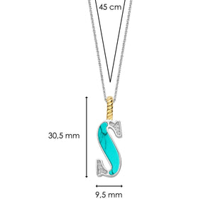 Omarm de eindeloze zomer met deze TI SENTO vergulde zilveren Letter S Hanger 6840TQ_S. Deze levendige hanger heeft een verfrissende turquoise steen die de letter ""S"" vormt in prachtig contrast met de fonkelende pavé van witte cubic zirconia. Gemaakt van glanzend 925 sterling zilver, verzilverd voor bescherming en langdurige glans. De clipring is verguld met een rijke goudkleur voor een weelderige en warme uitstraling. Laat de kleur turquoise je meenemen naar de Middellandse Zee en roep een onmiskenbare zomerse sfeer op. De letter S staat voor kracht en stijl, en vertegenwoordigt zelfvertrouwen en een scherp oog voor mode. Deze hanger is meer dan een accessoire; het is een speelse uitdrukking van je individualiteit. Draag hem solo voor een opvallend statement of combineer hem met andere letters of hangers voor een trendy, gelaagde look. De hanger wordt geleverd met een delicate zilveren ketting van 45 cm. Zorgvuldig vervaardigd voor de gevoelige huid, deze nikkelvrije en hypoallergene hanger biedt blijvend comfort en kwaliteit.