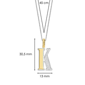Til je stijl naar een hoger niveau met de TI SENTO vergulde zilveren Letter K Hanger 6840ZY_K. Deze verfijnde hanger heeft een geelgoudkleurig inleg die de letter "K" vormt, in prachtig contrast met het sprankelende pavé van witte zirkonia. Vervaardigd uit glanzend 925 sterling zilver en verzilverd om het te beschermen en stralend te houden. De clipring is eveneens verguld, wat een gevoel van weelderige verfijning uitstraalt. De geelgoudkleurig inleg straalt een tijdloze warmte uit, die herinneringen oproept aan zonnige dagen. De letter K staat symbool voor kennis en wijsheid, wat groei en begrip vertegenwoordigt. Deze hanger is meer dan een sieraad; het is een canvas voor jouw zelfexpressie. Draag het solo voor een minimalistische uitstraling of combineer het met andere letters of hangers om een unieke look te creëren. De hanger wordt geleverd met een delicate zilveren ketting van 45 cm. Speciaal ontworpen voor een gevoelige huid, biedt deze nikkelvrije en hypoallergene hanger langdurig comfort en kwaliteit.