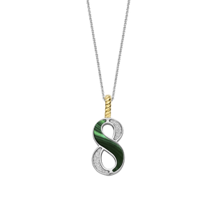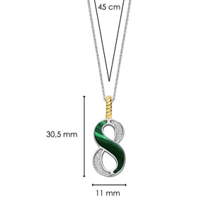 Elke hanger is uniek – de malachietgroene steen met zijn kenmerkende aderstructuur, geïnspireerd op echt malachiet, straalt natuurlijke elegantie uit. De subtiele variaties in kleurtinten en patronen maken elke hanger een uniek en tijdloos statement, ontworpen om te koesteren. Omarm oneindige balans met deze TI SENTO Nummer Acht Zilveren Hanger 6841MA_8. Gemaakt van hoogwaardig 925 sterling zilver en verzilverd om een langdurige glans te waarborgen, heeft deze hanger een opvallend ontwerp van het cijfer acht. Het cijfer is versierd met een betoverende malachietgroene steen, bekend om zijn transformatieve eigenschappen. Een sprankelend pavé van witte cubic zirconia steentjes maakt het ontwerp compleet en voegt een vleugje elegantie toe. De clipring is verguld, wat een luxueuze en stralende uitstraling geeft. Acht is een symbool van kracht, oneindigheid en manifestatie. malachietgroen, een steen van transformatie, versterkt de energie van de hanger en sluit aan bij de reis van zelfontdekking van de drager. Dit sieraad is perfect voor de moderne vrouw die op zoek is naar een vleugje luxe en individualiteit. Laat deze hanger het symbool zijn van jouw oneindige stijl. Draag hem solo voor een krachtig statement of combineer hem met andere geluksgetal-hangers voor een gelaagde look die vertrouwen en balans uitstraalt. De hanger wordt geleverd met een delicate zilveren ketting van 45 cm en is hypoallergeen en nikkelvrij, wat zorgt voor langdurig comfort en kwaliteit.