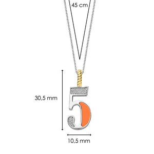 Omarm levendige energie met deze TI SENTO Nummer Vijf Zilveren Hanger 6841OR_5. Gemaakt van premium 925 sterling zilver en verzilverd voor een langdurige glans, toont deze hanger een opvallend ontwerp van het cijfer vijf. Het cijfer is versierd met een levendige oranje steen, die warmte en optimisme uitstraalt. Een sprankelend pavé van witte cubic zirconia steentjes maakt het ontwerp compleet en zorgt voor een opvallend contrast. De clipring is verguld, wat een luxueuze uitstraling geeft. Het cijfer vijf symboliseert verandering, vrijheid en avontuur. Het staat voor de kracht van verkenning en het omarmen van nieuwe mogelijkheden. Oranje, een kleur die staat voor creativiteit en enthousiasme, geeft deze hanger een dynamische energie. Deze hanger is perfect voor de moderne vrouw die op zoek is naar een vleugje zelfvertrouwen. Draag het solo voor een krachtig statement of combineer het met andere sieraden voor een gepersonaliseerde, gelaagde stijl. De hanger wordt geleverd met een fijne zilveren ketting van 45 cm en is hypoallergeen en nikkelvrij.