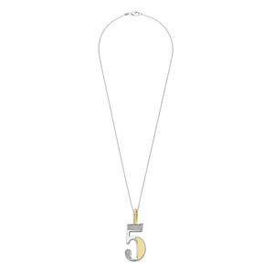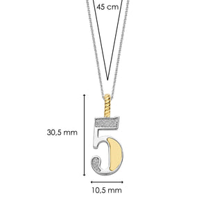 Verwen jezelf met luxe met deze TI SENTO Nummer Vijf Zilveren Hanger 6841ZY_5. Gemaakt van premium 925 sterling zilver en verzilverd voor een langdurige glans, toont deze hanger een verfijnd ontwerp van het cijfer vijf. Het cijfer is voorzien van een luxueuze geelgoudkleurig inleg, die warmte en verfijning uitstraalt. Een sprankelend pavé van witte cubic zirconia steentjes maakt het ontwerp compleet en verhoogt de algehele elegantie. De clipring is verguld, wat een extra vleugje luxe toevoegt. Het cijfer vijf symboliseert verandering, vrijheid en avontuur. Het staat voor de kracht van exploratie en het belang van het omarmen van het onbekende. geelgoudkleurig, een symbool van rijkdom en welvaart, versterkt de luxueuze uitstraling van deze hanger. Deze hanger is perfect voor de moderne vrouw die op zoek is naar een vleugje stijl en luxe. Draag het solo voor een krachtig statement of combineer het met andere sieraden voor een gelaagde look die moeiteloze elegantie uitstraalt. De hanger wordt geleverd met een fijne zilveren ketting van 45 cm en is hypoallergeen en nikkelvrij.