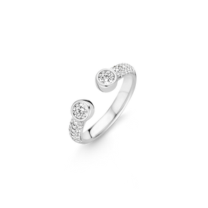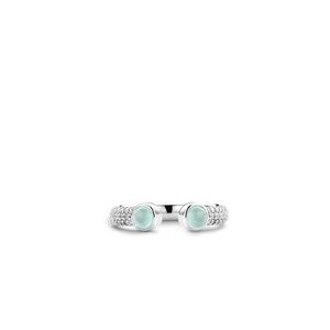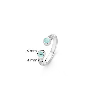 Deze TI SENTO ring lijkt zich om je vinger buigen. De ring heeft aan de bovenzijde een opening tussen twee aqua groene crystals wat voor een speels effect zorgt. De crystals zijn facet geslepen en gezet in een strakke gladomzetting, wat goed past bij het moderne ontwerp. De beide zijkanten zijn pavé gezet met zirconia. De ring is gemaakt van gerhodineerd sterling zilver.