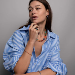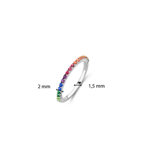 Ring gekocht met regenboog steentjes. De ring valt mooi om de vinger en is mooi subtiel. Deze ring kan ook aangeschoven worden bij andere ringen. Erg tevreden en blij met de ring!