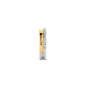 Deze TI SENTO vergulde zilveren ring 12271ZY bestaat uit twee reeksen van rechthoekjes. Een van de reeksen is gedecoreerd met een handgezet pavé van witte cubic zirconia steentjes en de ander plated... lees meer
