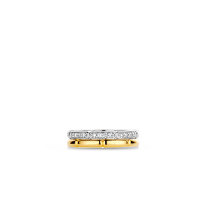 Deze TI SENTO vergulde zilveren ring 12271ZY bestaat uit twee reeksen van rechthoekjes. Een van de reeksen is gedecoreerd met een handgezet pavé van witte cubic zirconia steentjes en de ander plated met goud. De ring is gemaakt van 925 sterling zilver. Draag haar gouden gloed overal bij je.