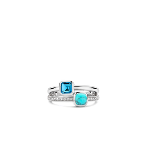 Deze zilveren TI SENTO ring 12326DB is een fascinerende mix van verfijning en veelzijdigheid. De ring heeft twee gestapelde ringen: de ene heeft een vierkante, levendige turkooizen steen, subtiel gez... lees meer