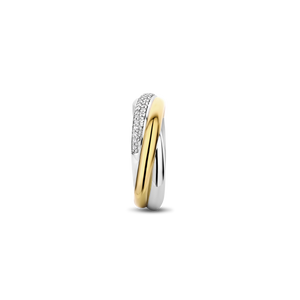 Ervaar hedendaagse elegantie met de TI SENTO gouden ring 12343ZY. Dit betoverende sieraad heeft twee vloeiende ringen die elkaar elegant kruisen, wat zorgt voor een dynamisch en opvallend ontwerp. De ene ring is bezet met schitterend pavé van witte zirconia-stenen en de andere ring is verguld met een stralende goudkleur. Het contrast tussen het romantische pavé en warm, rijke goudkleur geeft een betoverende uitstraling aan je handen. Gemaakt van 925 sterling zilver en verzilverd voor langdurige schittering, is deze ring een voorbeeld van moderne luxe. De vloeiende lijnen en harmonieuze mix van materialen maken het een werkelijk uitzonderlijk sieraad. Versterk je dagelijkse look met deze verfijnde accessoire. Met zorg vervaardigd voor gevoelige huid, zorgt deze nikkelvrije en hypoallergene ring voor langdurig comfort en kwaliteit.
